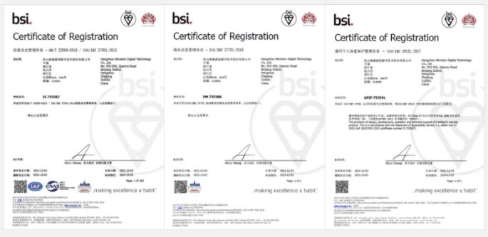 近日,海康威視正式獲得由國(guó)際**標(biāo)準(zhǔn)研發(fā)和認(rèn)證評(píng)審機(jī)構(gòu)英國(guó)標(biāo)準(zhǔn)協(xié)會(huì)(BSI)頒發(fā)的ISO/IEC 27701:2019及ISO/IEC 29151:2017體系認(rèn)證,意味著海康威視所建立的隱私信息管理···
